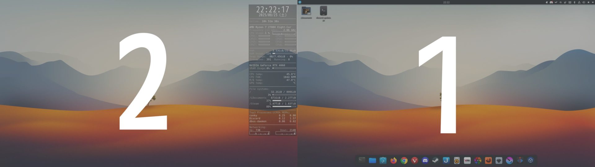 左画面が拡張画面で、ブラウザとSNS(Discord)開きっぱなしで、Conkyも見えてみたいな。